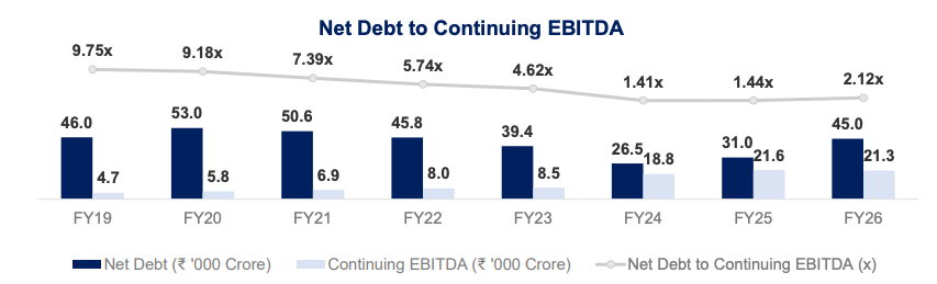 To fund all of this, debt is going up again. Net debt has risen to about ₹45,000 crore, compared to roughly ₹31,000 crore a year ago. The company also raised ₹7,500 crore through non-convertible debentures recently. While management insists that most expansion will be funded through internal accruals, the balance sheet is clearly getting heavier.