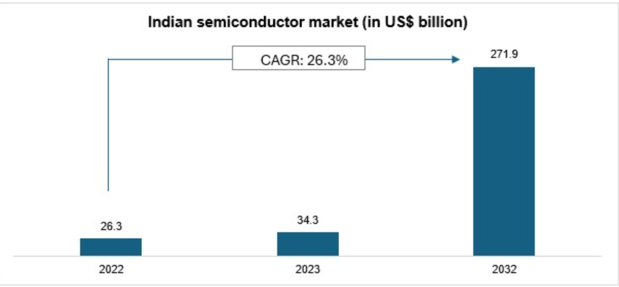 In 2022, the Indian semiconductor market was valued at $26.3 billion and is projected to expand at an annual rate of 26.3% to $271.9 billion by 2032. This, driven by demand from smartphones, cars, factories, and data centers.