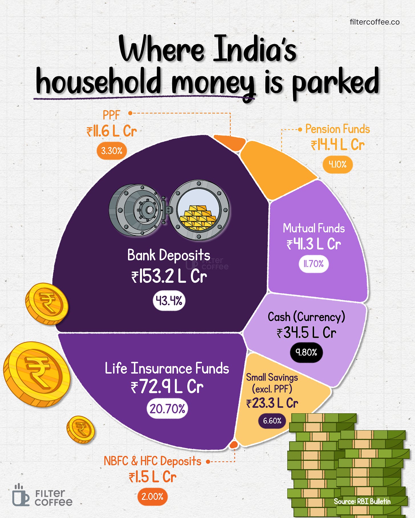 A large share is parked in bank deposits, followed by life insurance, showing a clear tilt toward security. While mutual funds and other market-linked options are growing, they still form a much smaller portion.
