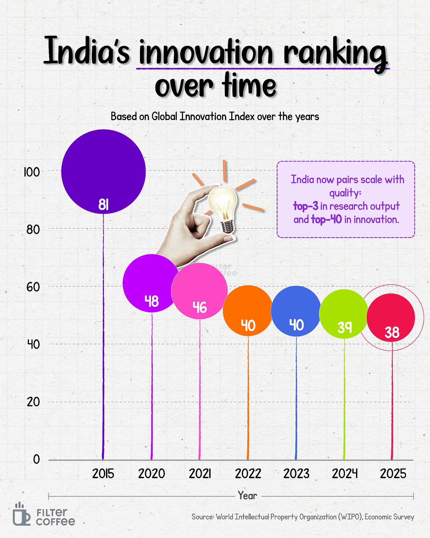 The big picture: India is no longer just scaling up, it’s improving in quality too. The country now ranks among the top 3 globally in research output and is firmly inside the top 40 in overall innovation.