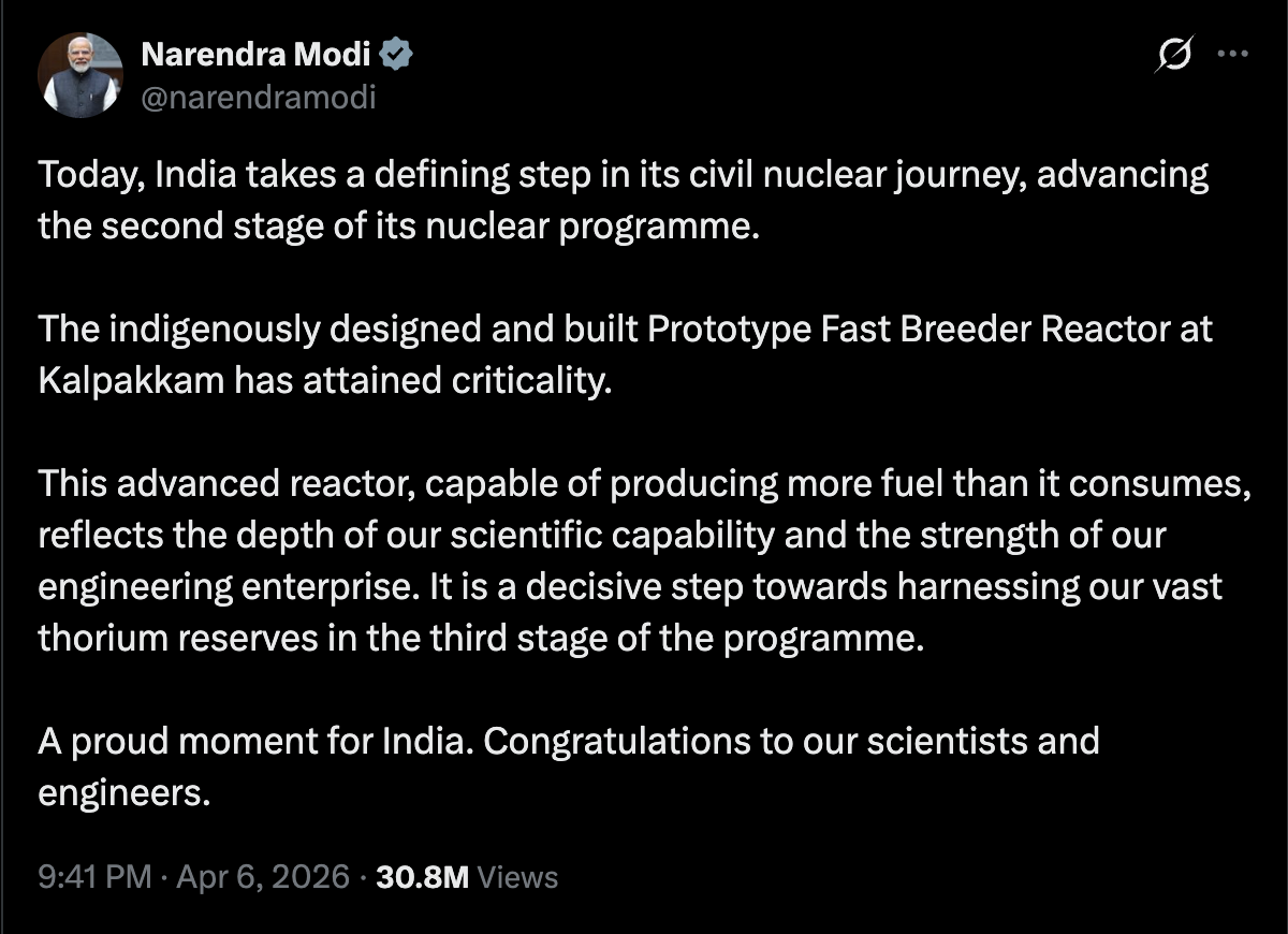 Why is it important: this reactor is critical to India’s long-term energy strategy. With limited uranium but vast thorium reserves, it can convert thorium into usable fuel, something conventional reactors cannot do.