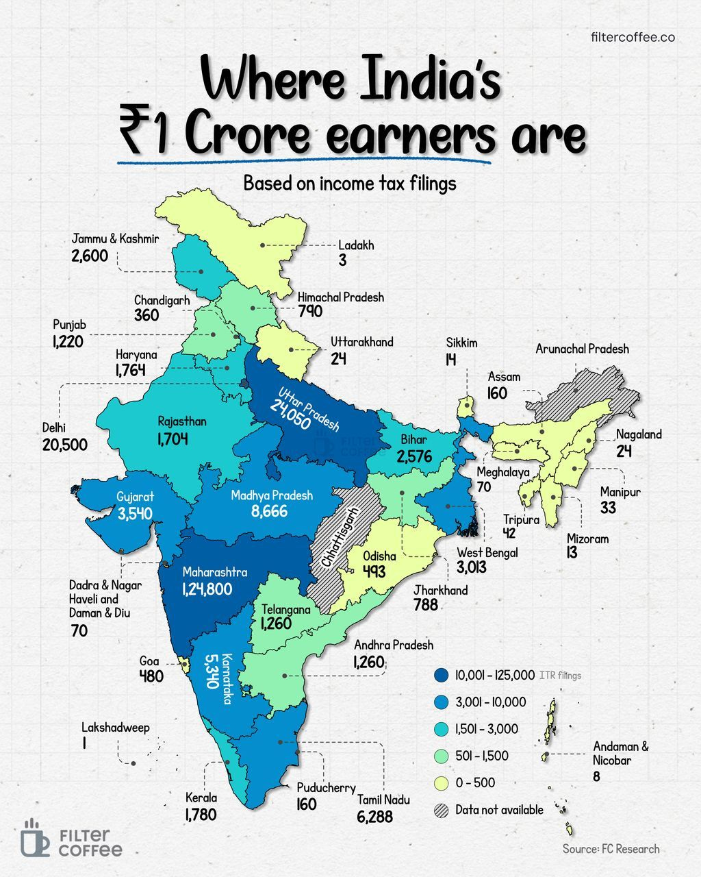India’s ₹1 crore+ income earners are heavily concentrated in a few states, with Maharashtra leading by a huge margin at over 1.24 lakh filers.