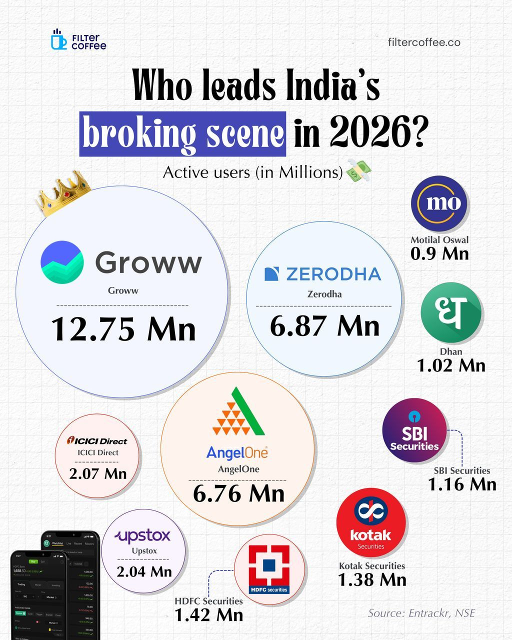 What’s interesting is the shift: discount brokers and app-first platforms are dominating, while traditional players like ICICI Direct, HDFC Securities, and Kotak trail behind in user scale.