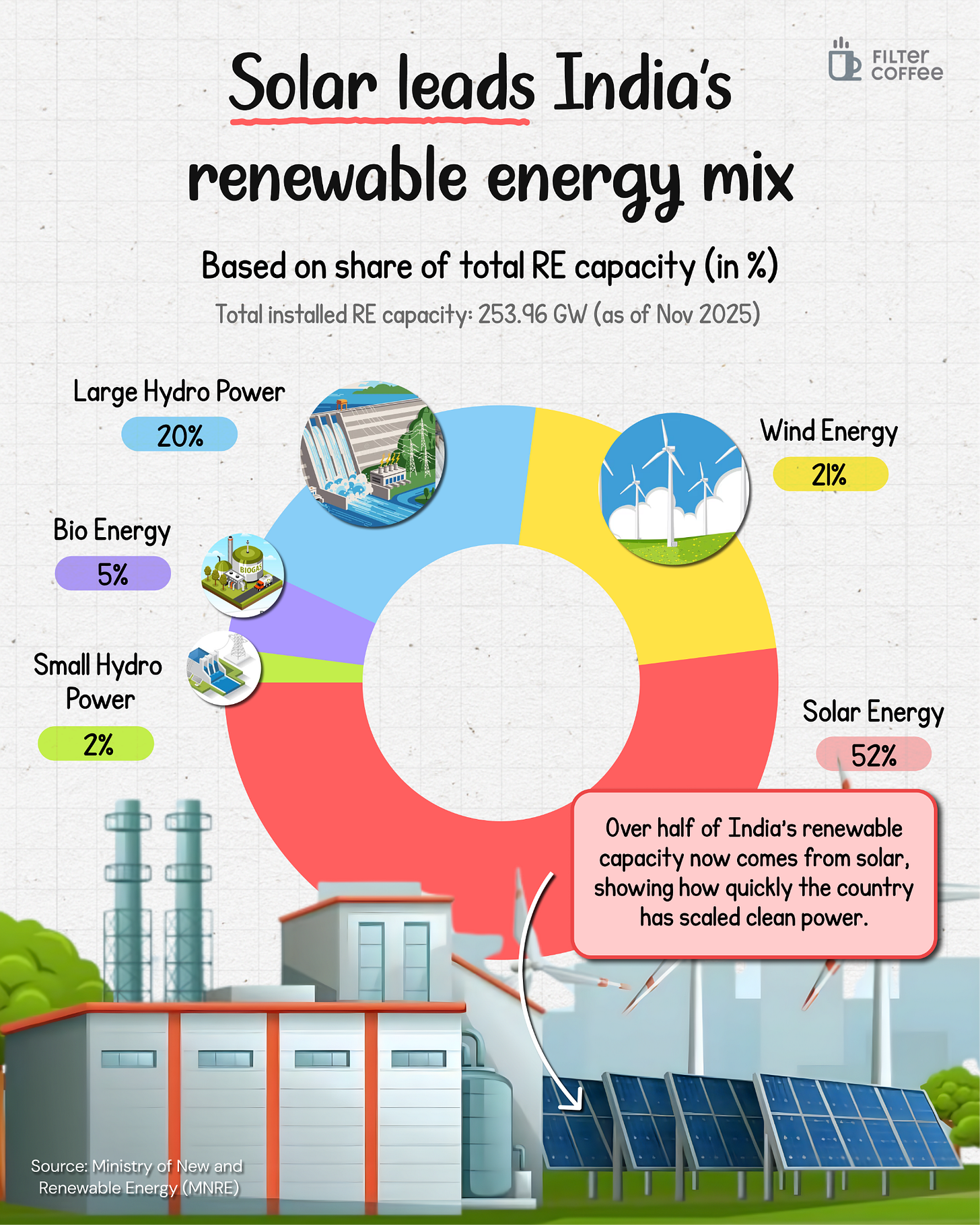 Solar power now accounts for 52% of the country’s total renewable energy capacity, making it the largest contributor by a wide margin.