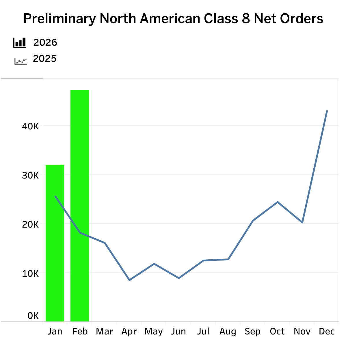 The deets: according to transport data firm FTR Intelligence, orders for large heavy-duty trucks in North America hit 47,200 units in February, a 159% jump from last year.