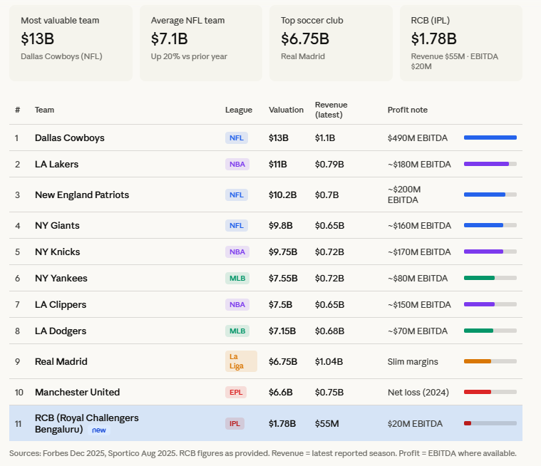 Big picture: RCB is now valued at about $1.78 billion (₹16,700 crore), that’s nearly a 15x jump from what it was worth in 2008. Separately, a lot of people believe IPL teams could eventually rival leagues like the NFL, EPL, F1, or NBA.