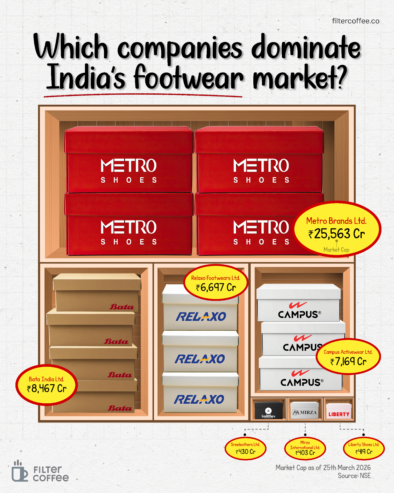 India’s footwear market is largely dominated by a few big players, with Metro Brands leading the pack. But Bata, Relaxo, and Campus are not far behind, each building a strong presence in different segments.