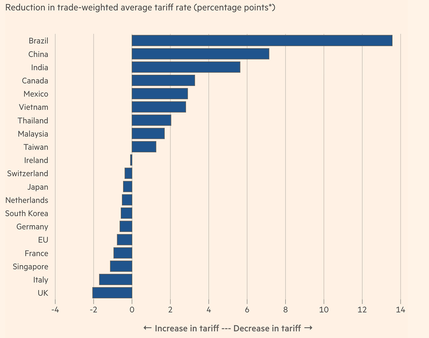 Now comes the twist. Data analysis by Global Trade Alert shows that countries Trump had earlier targeted the hardest like Brazil and China may actually see their average tariff burden fall under the new 15% flat regime. Brazil sees the sharpest drop. China follows.