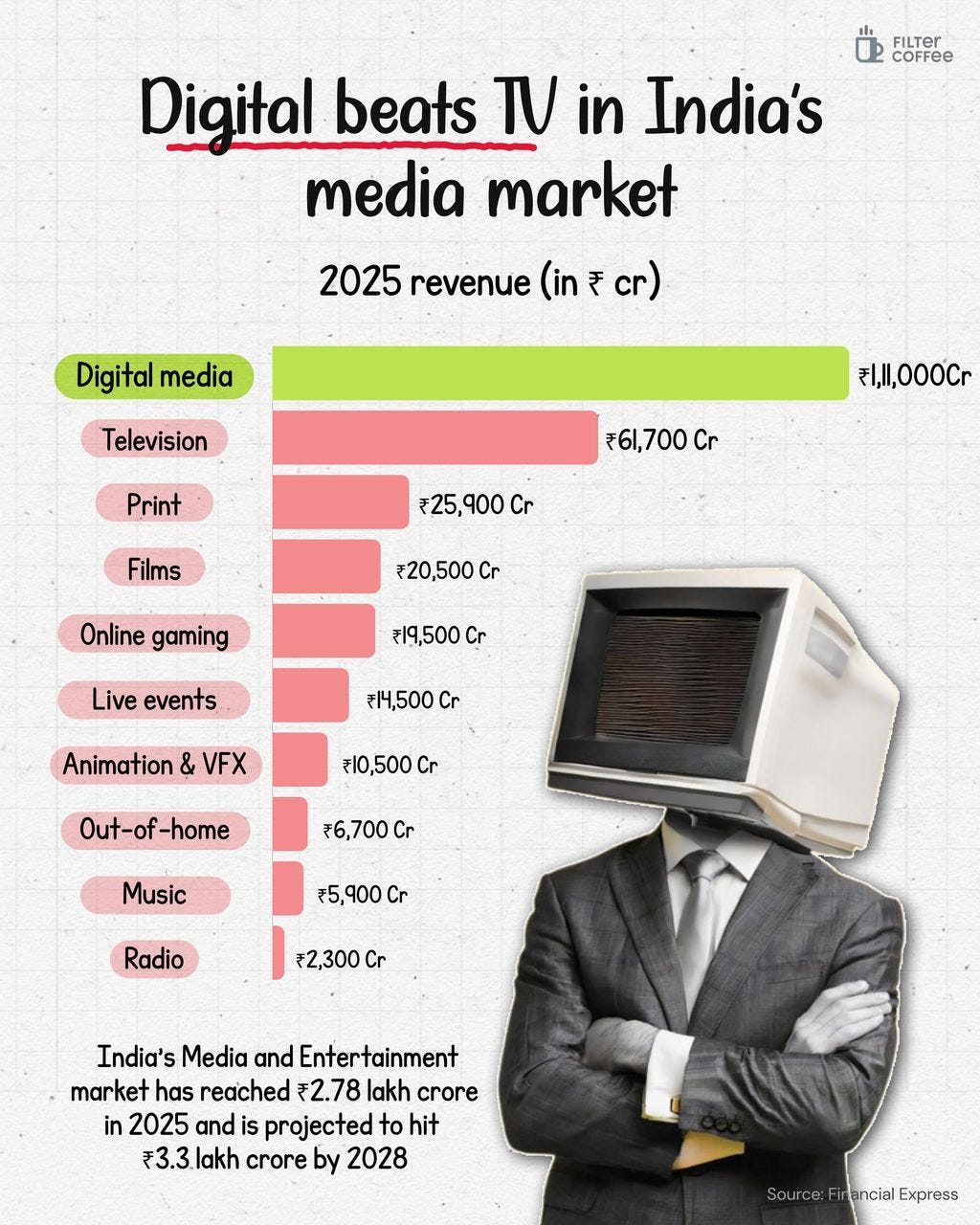 Digital media is clearly taking the lead in India’s media space, moving ahead of traditional formats like television, print, and radio.