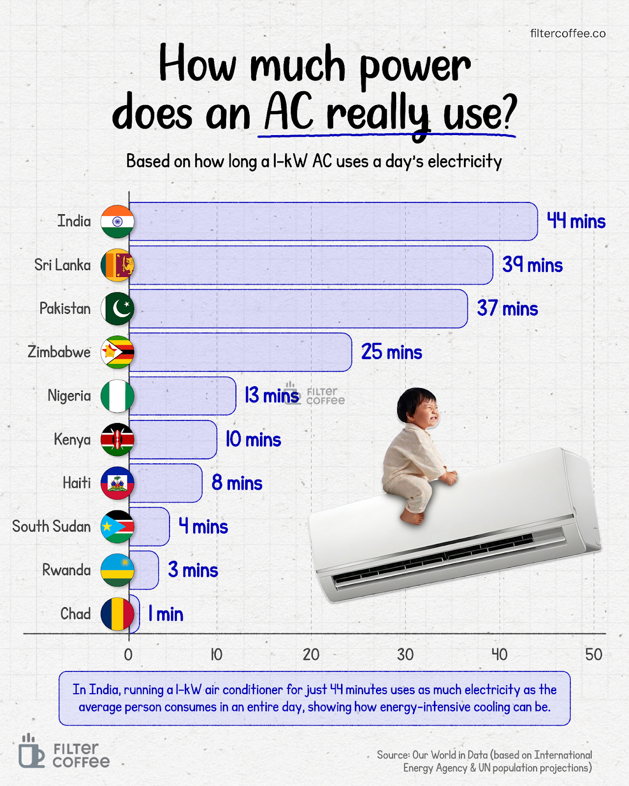 Turns out, your AC is far more power-hungry than you think. In India, running a 1 kW air conditioner for just 44 minutes consumes as much electricity as the average person uses in an entire day. Thatās one of the highest among countries, even above Sri Lanka (39 mins) and Pakistan (37 mins).