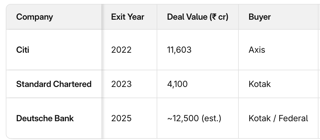 Global banks have been slowly pulling back from this segment. Citi exited in 2022, selling its massive ā¹7.1 lakh crore portfolio to Axis Bank. Standard Chartered followed in 2023, offloading a ā¹4,100 crore portfolio to Kotak Mahindra Bank.
