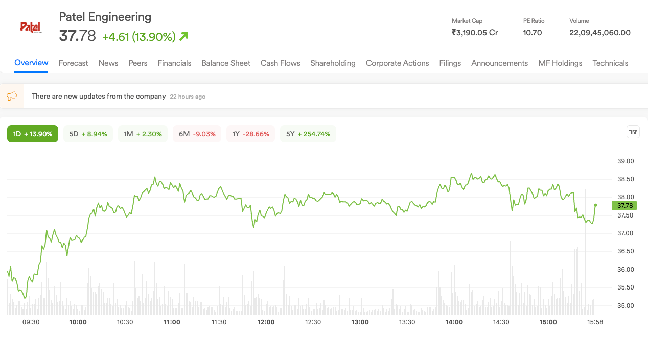 Patel Engineering’s shares shot up 15% intraday after the company received two major work orders worth ₹798.1 crore.
