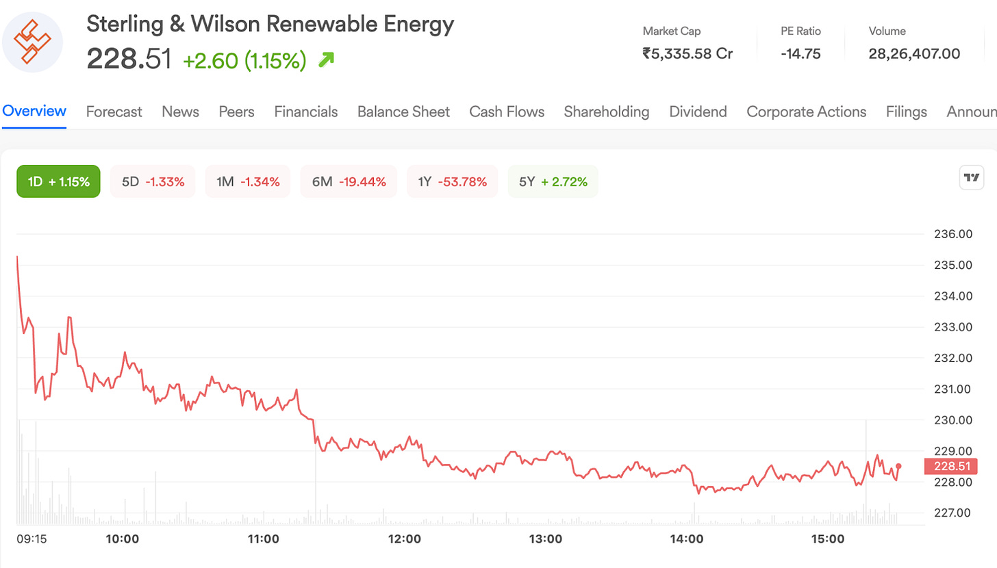 Sterling and Wilson Renewable Energy has bagged a solar project of 240 MW AC worth ₹1,313 crore in South Africa. The stock gained on the back of this news.