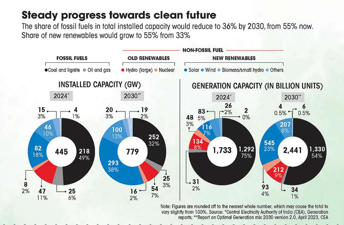 In the long-term: India’s power mix is steadily shifting cleaner, with fossil fuels falling from 55% today to 36% by 2030, while new renewables rise from 33% to 55% of installed capacity.