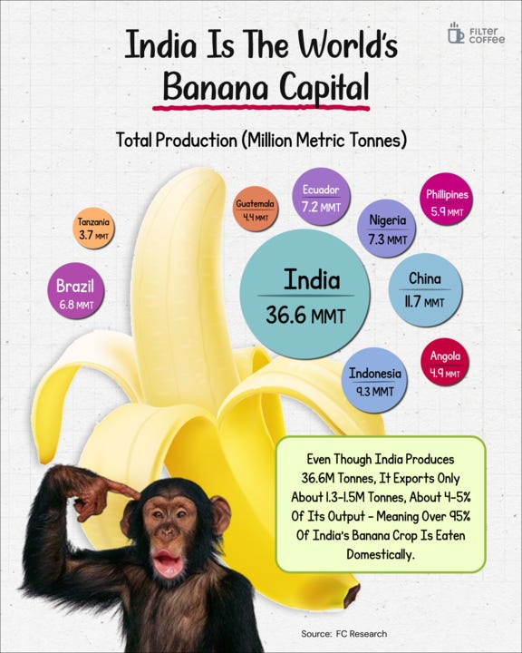 That means over 95% of India’s bananas are consumed domestically, making it a story of scale driven almost entirely by local demand rather than exports.