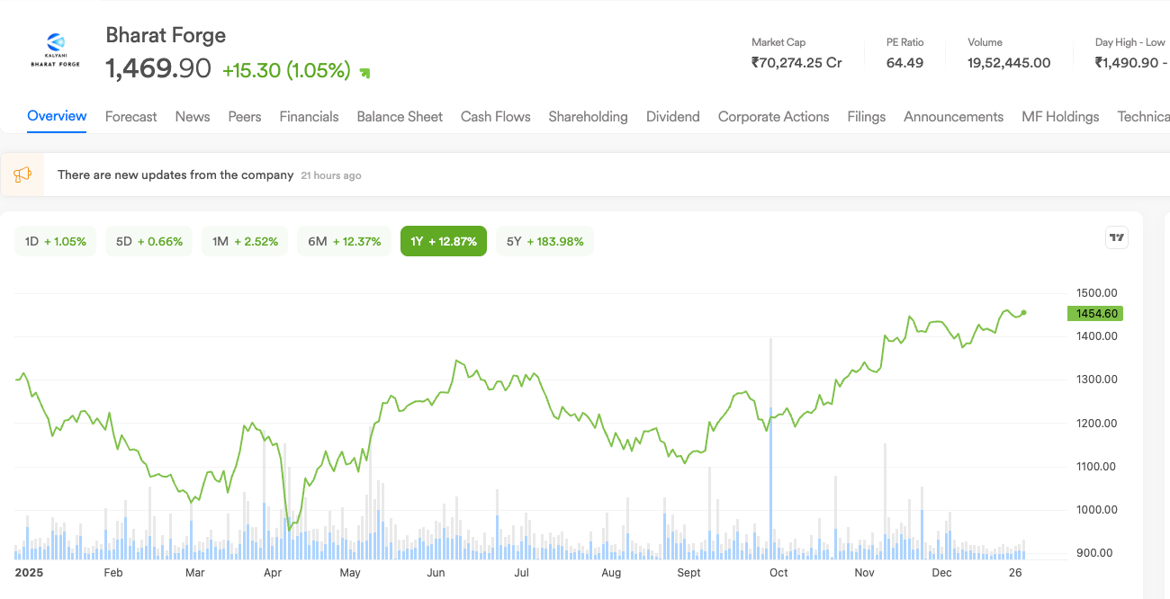 Bharat Forge’s stock moved higher after the company signed its largest-ever small arms contract with the Ministry of Defence, worth ₹1,661.9 crore, for the supply of Close Quarter Battle (CQB) carbines.