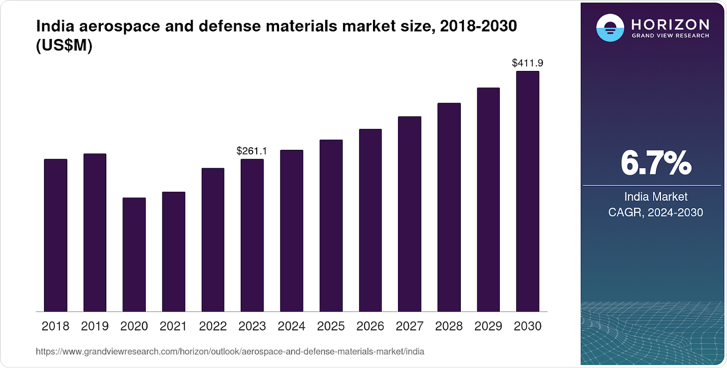 Zoom out: India’s aerospace and defence materials market is on a steady growth path, expected to reach $412 million by 2030. Driven by a 6.7% annual rate, the expansion reflects rising defence spending.