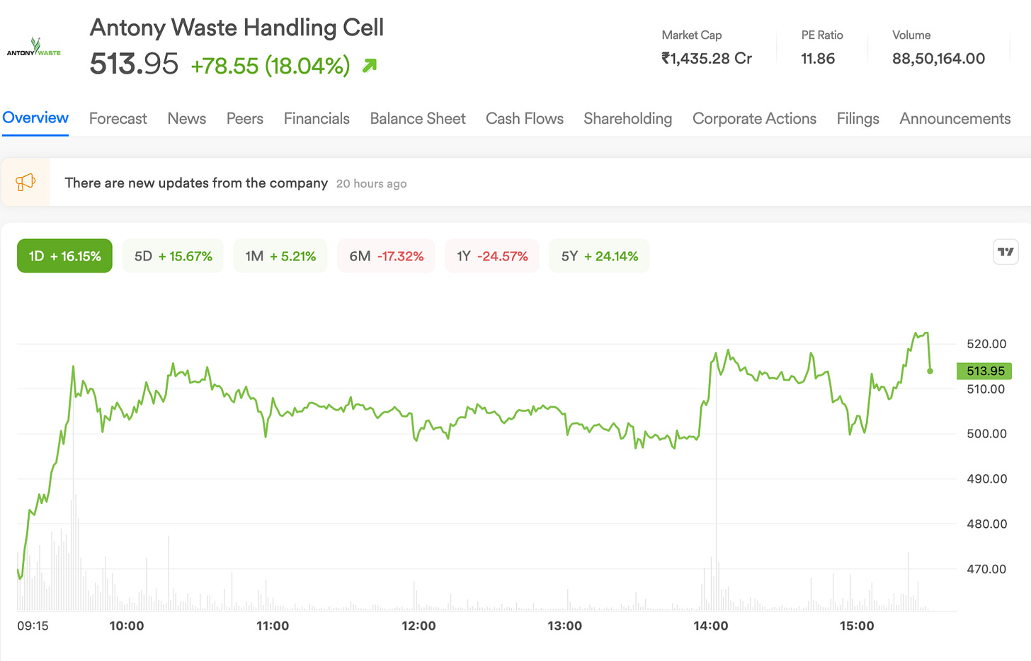 Antony Waste Handling Cell announced that its subsidiary, AG Enviro Infra Projects, has secured two major collection and transportation contracts. The stock gained 16% on the back of this news.