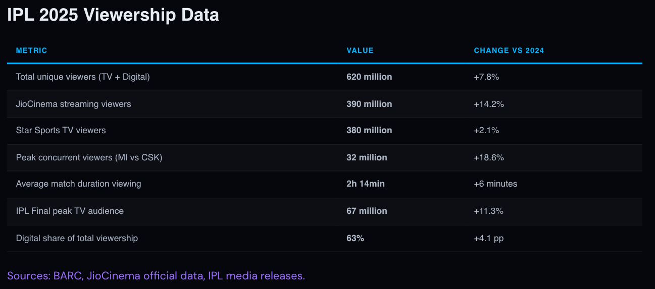 Moreover, the IPL today reaches over 600 million digital viewers and is streamed across more than 120 countries. Platforms like JioHotstar alone command a massive share, often with 60–65% of viewers on mobile and 35–40% on connected TVs.