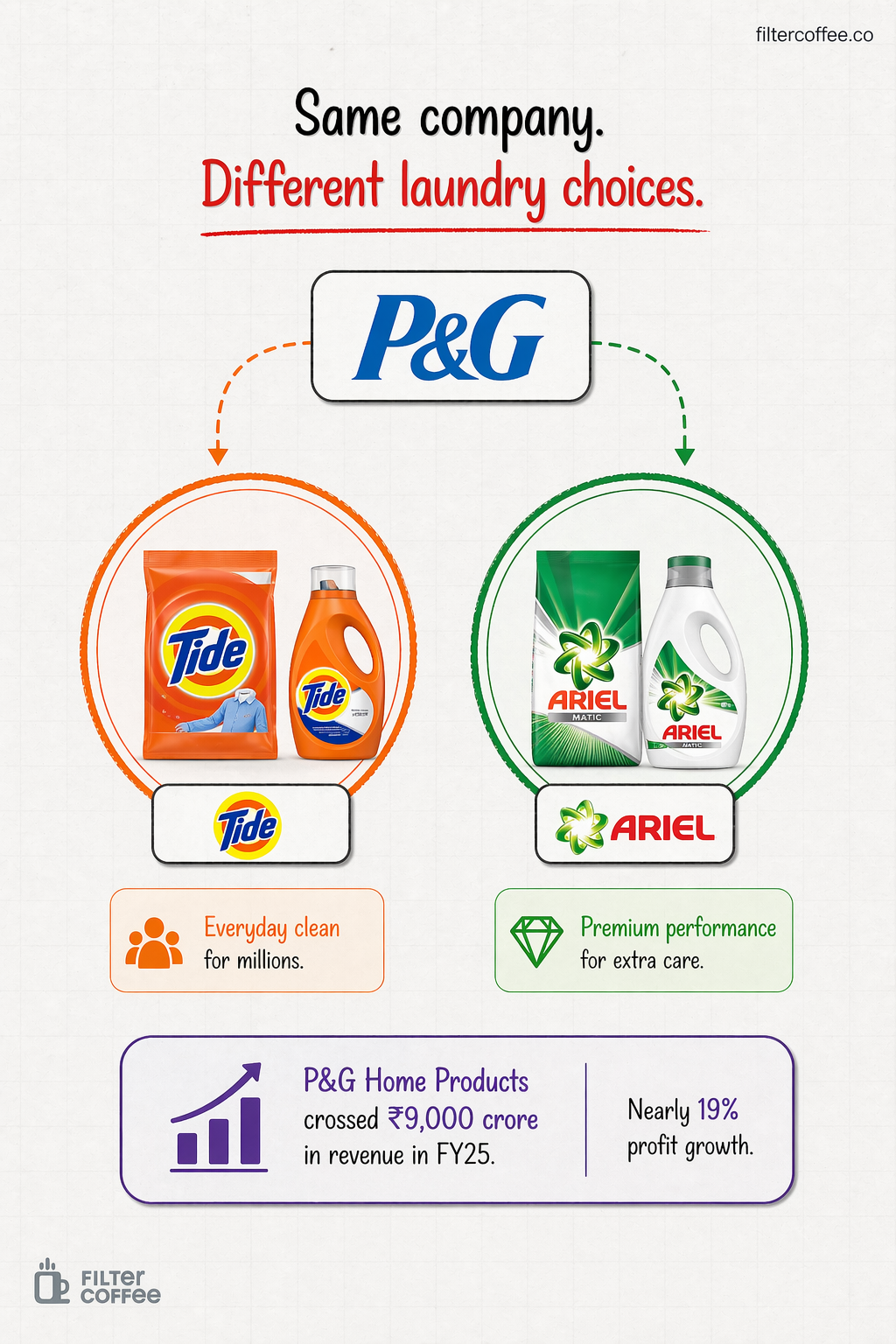 Brands like Tide and Ariel coexist within P&G’s portfolio, each targeting slightly different consumer segments. One leans more mass, the other more premium performance.