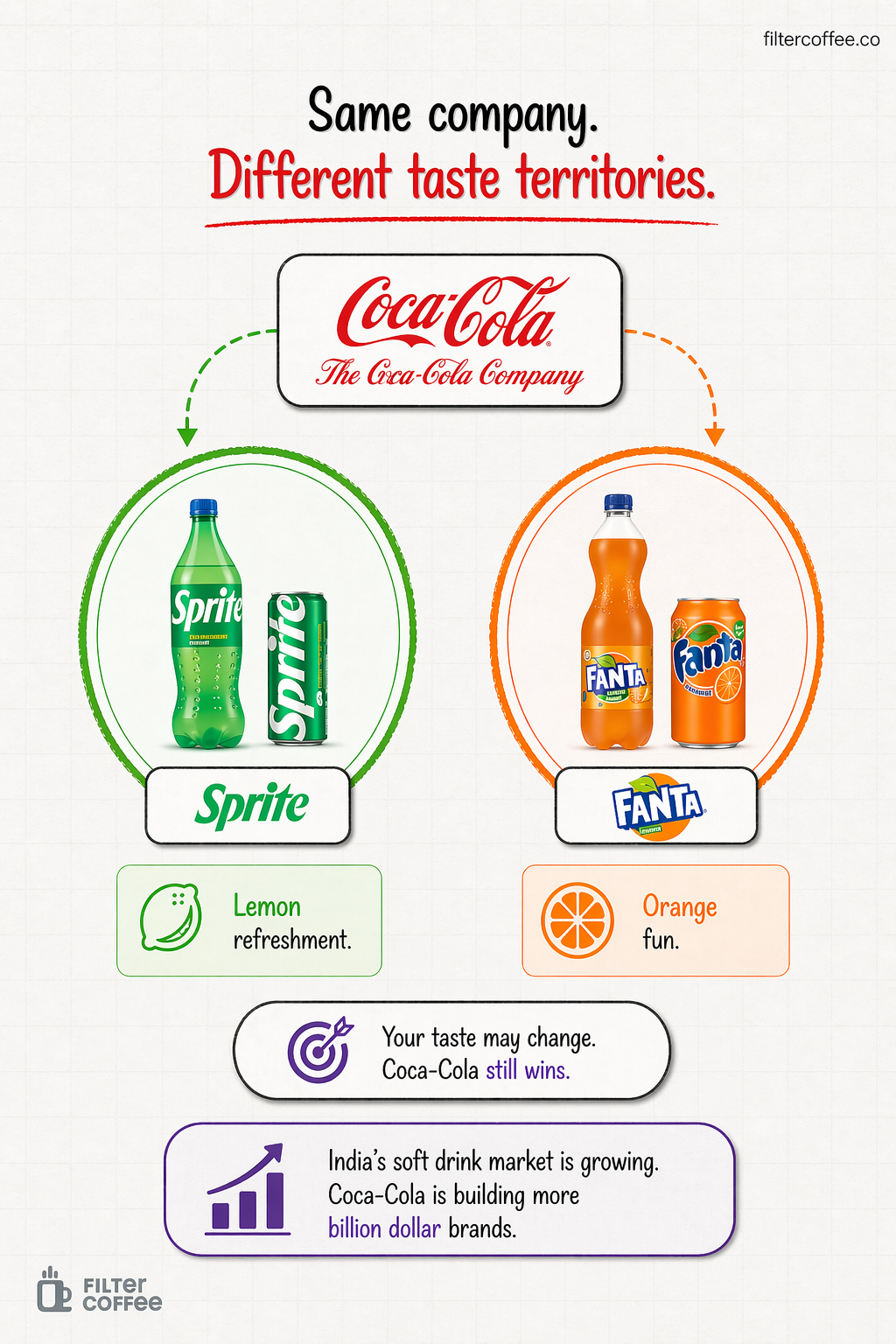 Coca-Cola sells both Sprite and Fanta, which seem like direct competitors are actually dominating different taste territories.