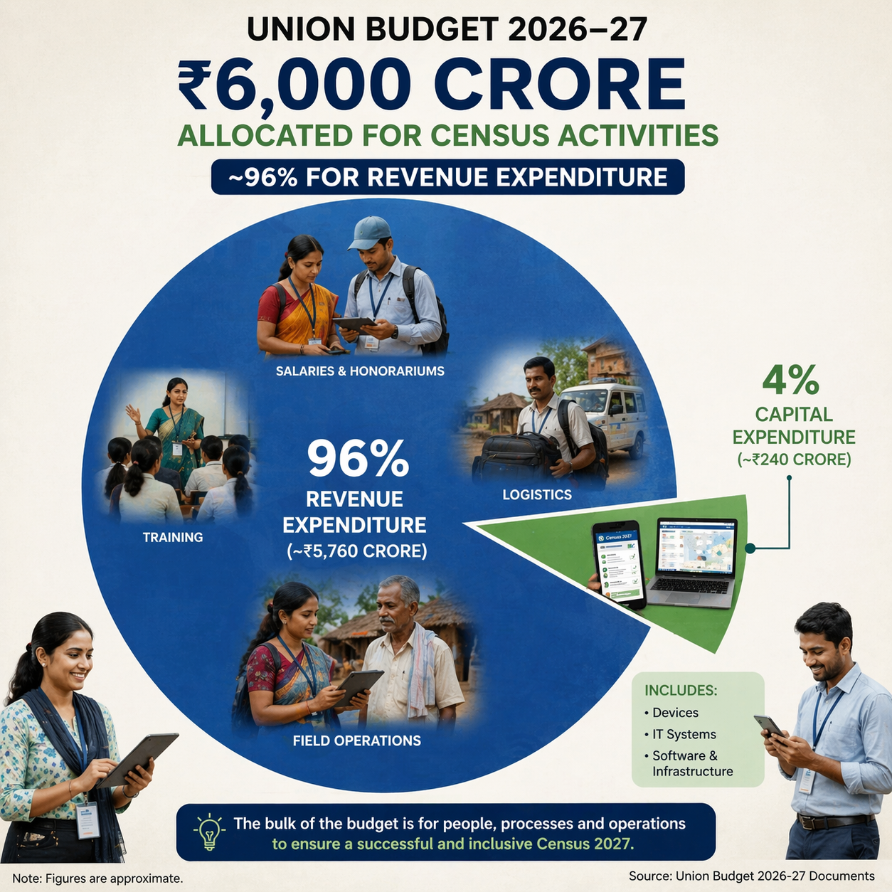 In the Union Budget for 2026-27, about ₹6,000 crore has been allocated for census activities, and roughly 96% of this is revenue expenditure.