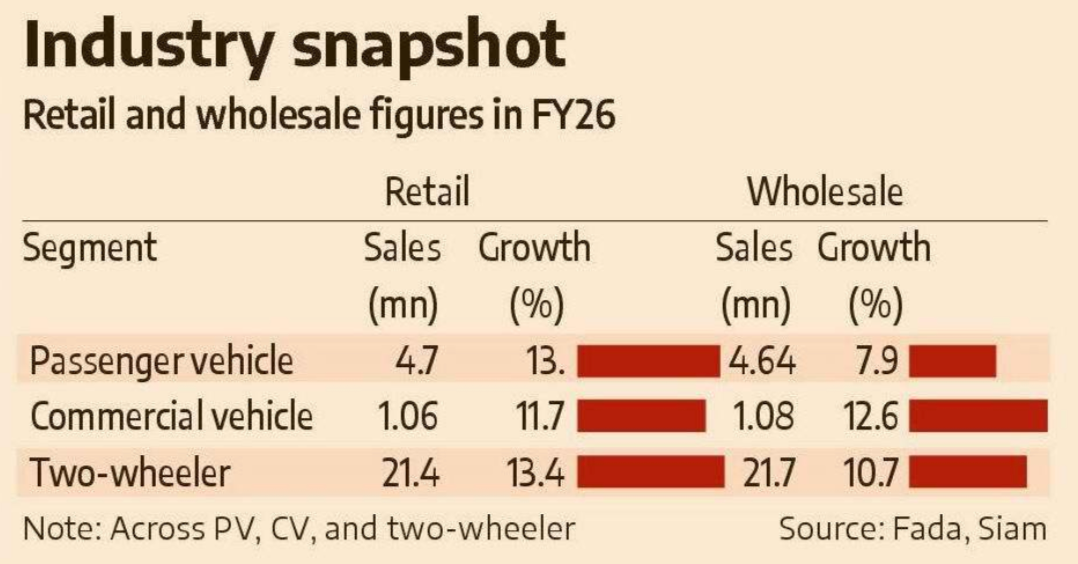 Retail passenger vehicle sales for that month alone hit around 4,40,000 units, one of the strongest monthly numbers on record. Across all vehicle categories, India clocked nearly 3 crore units in total retail volumes in FY26.