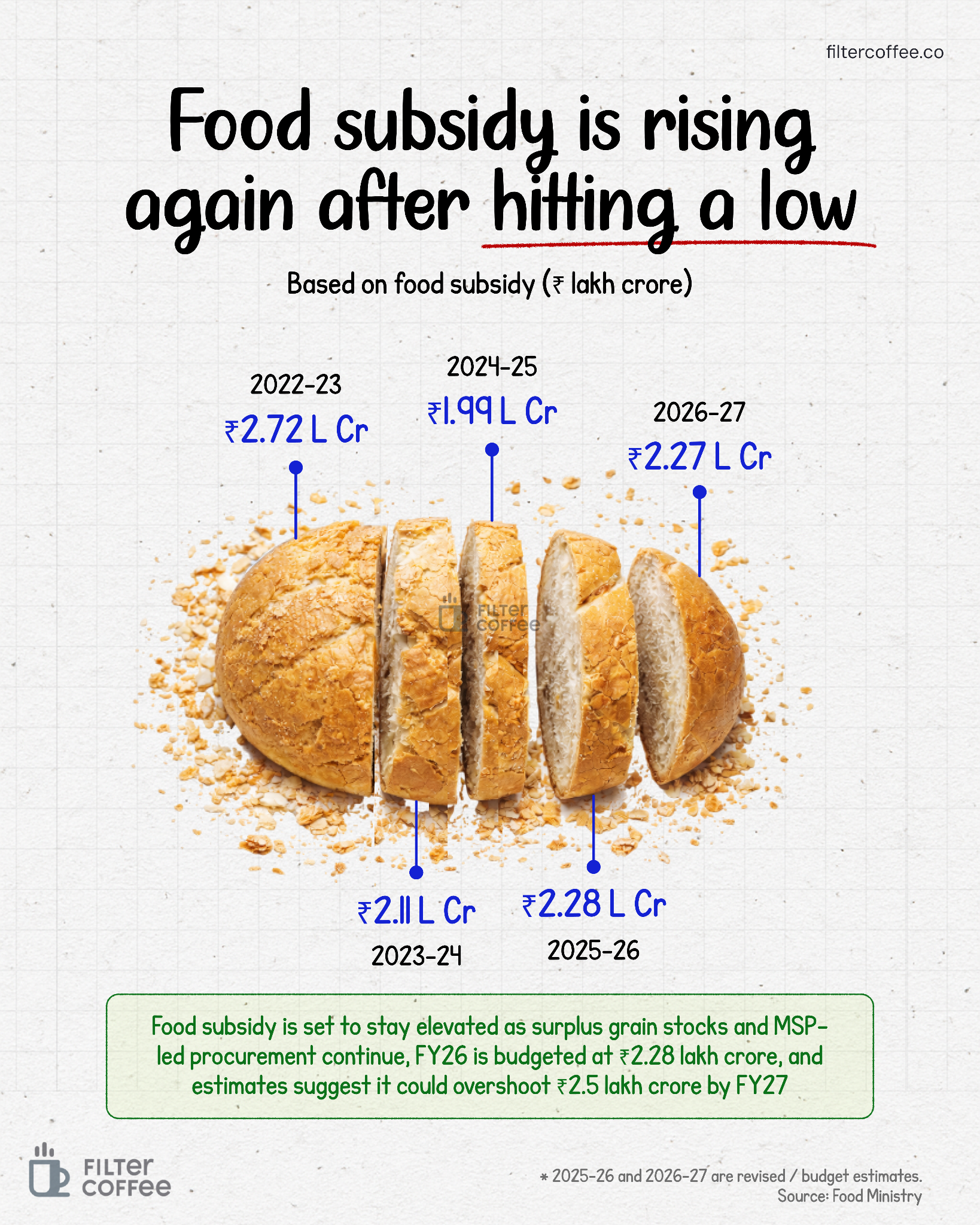 Because procurement remains aggressive. The government continues to buy wheat and rice in large volumes because MSP keeps rising. For the 2026-27 marketing season, MSP for wheat has been raised again.