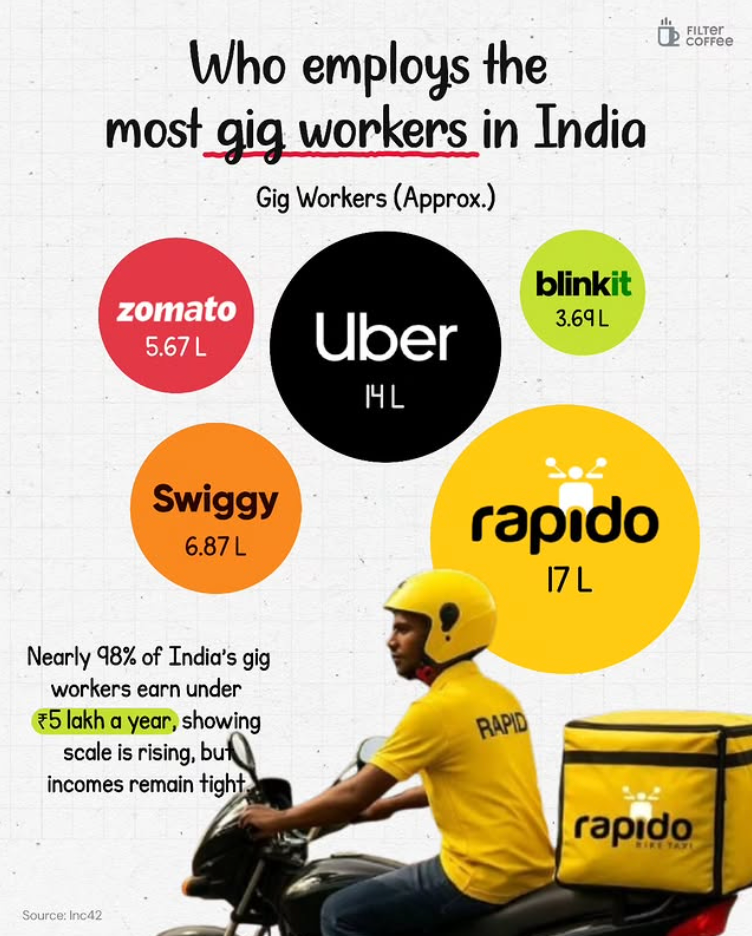 Platforms like Rapido, Uber, Swiggy and Zomato are now among the largest employers in the country, each running fleets of workers that rival traditional industries. Rapido alone is estimated to have around 17 lakh gig workers. Uber comes close with about 14 lakh.