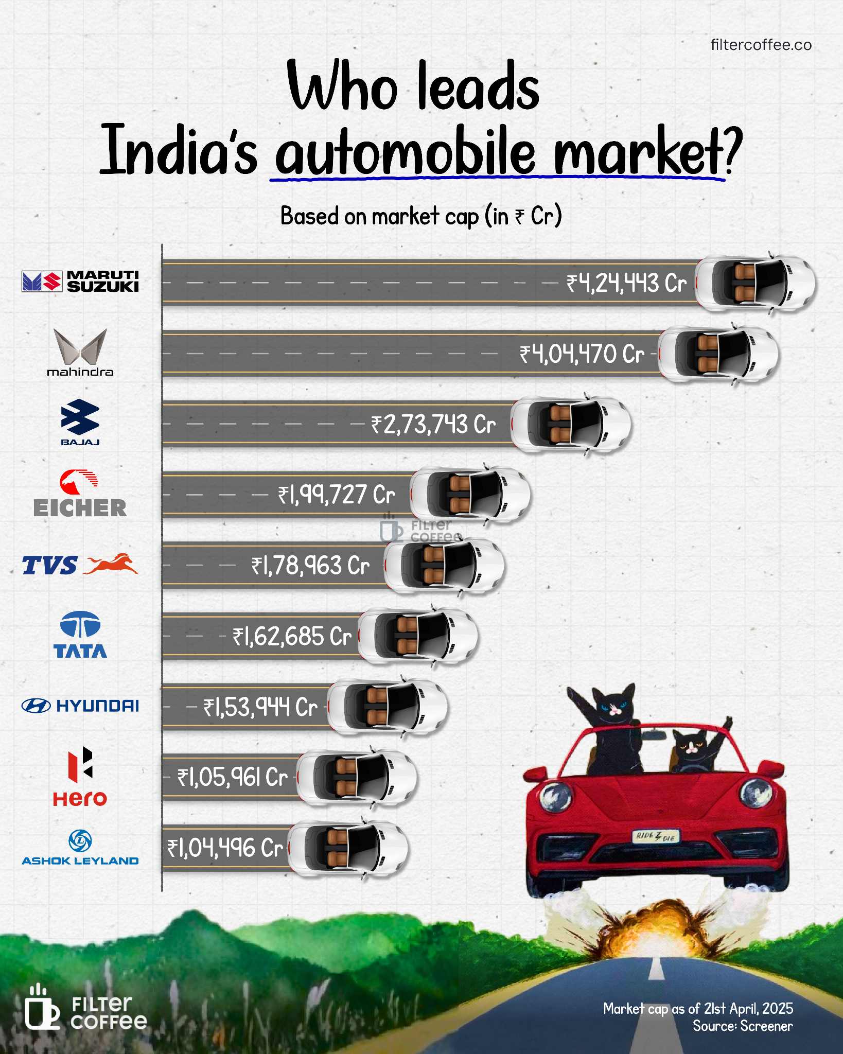 As of April 2025, Maruti Suzuki sat at the top with a market cap of about ₹4.2 lakh crore, closely followed by Mahindra at ₹4.0 lakh crore, with Bajaj Auto a distant third.