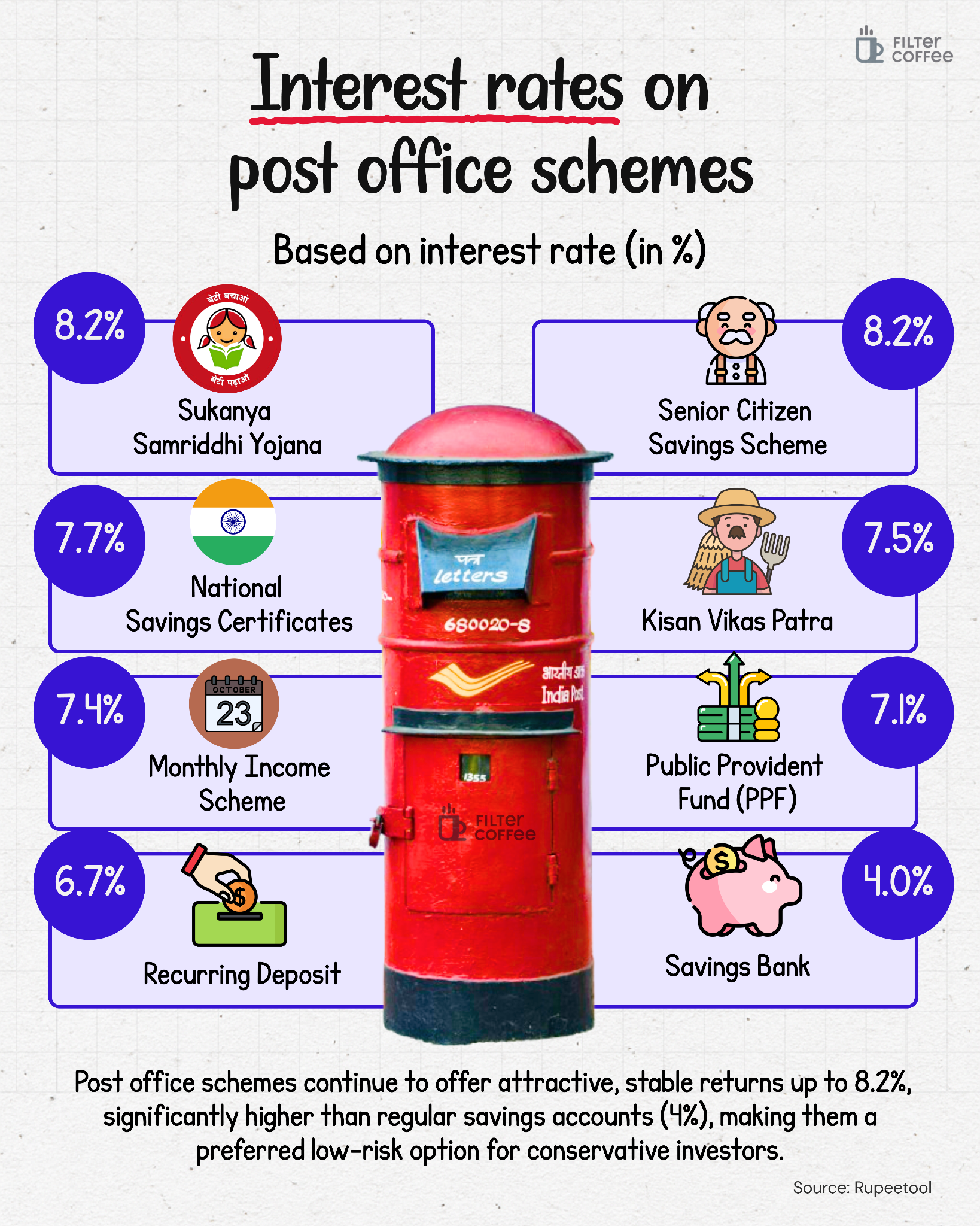 Sukanya Samriddhi Yojana and the Senior Citizen Savings Scheme continue to offer 8.2%, National Savings Certificates sit at 7.7%, Kisan Vikas Patra at 7.5%, Monthly Income Scheme at 7.4%, and the long-trusted Public Provident Fund remains at 7.1%.